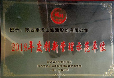 2018年3月,寶塔山漆被陜西省企業(yè)信用協(xié)會(huì)與陜西省企業(yè)信用年度創(chuàng)新峰會(huì)組委會(huì)評(píng)為“2018年度創(chuàng)新管理示范單位”
